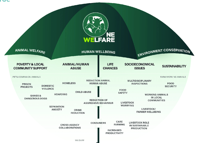 One Welfare complementa los enfoques One Health y Eco Health, permitiendo la integración total del bienestar animal en otras disciplinas; una herramienta muy necesaria para ayudar a mejorar el bienestar animal, el bienestar humano y los componentes ambientales, y apoyar los objetivos de desarrollo sostenible a nivel mundial para todos aquellos interesados en ampliar el enfoque de una sola salud al bienestar animal y al bienestar humano.